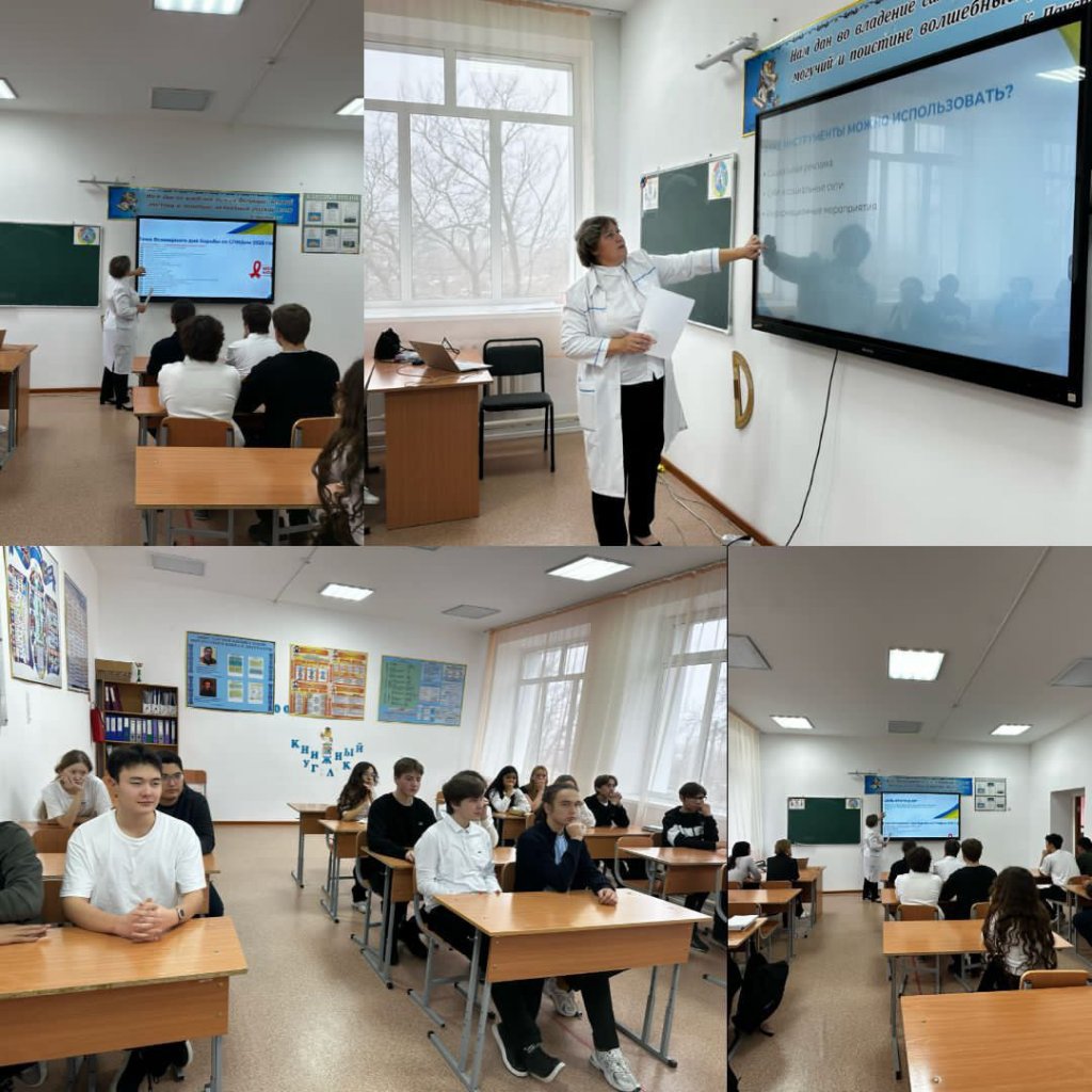 1 желтоқсанда Дүниежүзілік ЖИТС-пен күрес күні аясында мектеп медбикесі Н. Б. Чубарова жоғары сынып оқушыларымен профилактикалық әңгіме өткізді. Іс-шараның мақсаты-оқушылардың АИТВ/ЖИТС туралы хабардар болу деңгейін арттыру, өз денсаулығына жауапкершілікпен қарауды қалыптастыру және қауіпсіз мінез-құлық дағдыларын дамыту.